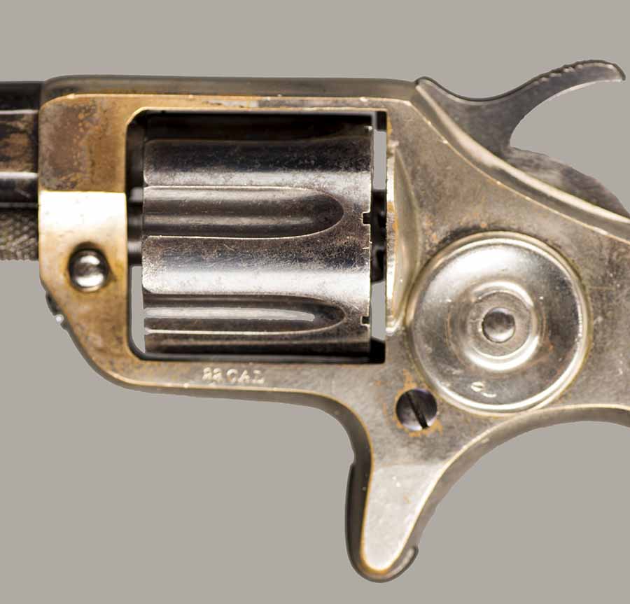 #46615. Cal. 22 Rim Fire. 2 1/4" Barrel. 7 shot cylinder. Second model with long cylinder flutes, locking slots on cylinder back and patent date stamped on barrel. Nickel/Blue finish. Has 90% of the original finish remaining. Comes with beautifull pearl grips. Perfect "COLT NEW 22" etched panel on left side of barrel. Standard Colt address on top of barrel, Patent is visible under the barrel. Mechanically perfect, with a very fine bore and seven near new chambers in the cylinder. Matching serial numbers. Made in 1877. Total production of the second model is about 39.000. Excellent overall. Cartridges shown for information purposes only.