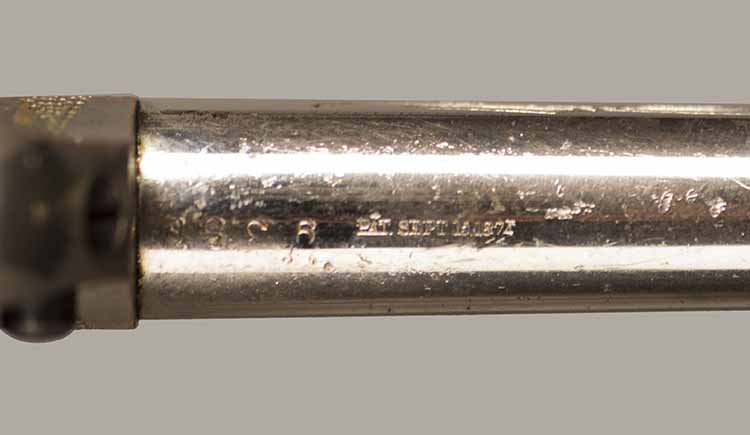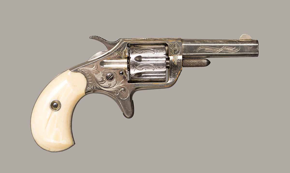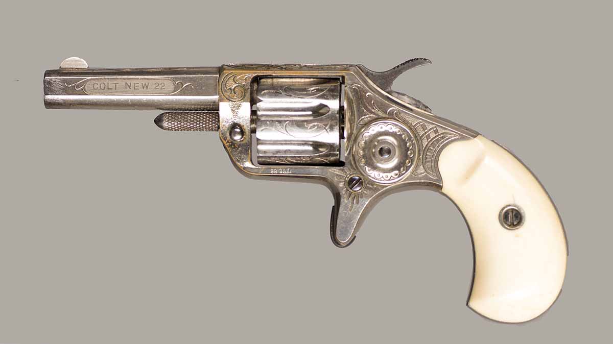 #19350. Cal. 22 Rim Fire. 2 1/4" Barrel. 7 shot cylinder. Second model with long cylinder flutes, locking slots on cylinder back and patent date stamped on barrel. Standard pattern factory engraving , nickel finish. Has 99% of the original finish remaining. Comes with beautifull ivory grips. Engraved .22 caliber New Line pistols were nearly always fitted with ivory or pearl grips. Perfect "COLT NEW 22" etched panel on left side of barrel. Standard Colt address on top of barrel. Patent is visible under the barrel. Matching serial numbers. Mechanically perfect, with a excellent bore and seven near new chambers in the cylinder. Made in 1876. Total production of the second model is about 39.000. Excellent overall, would be difficult to improve! Cartridges shown for information purposes only.