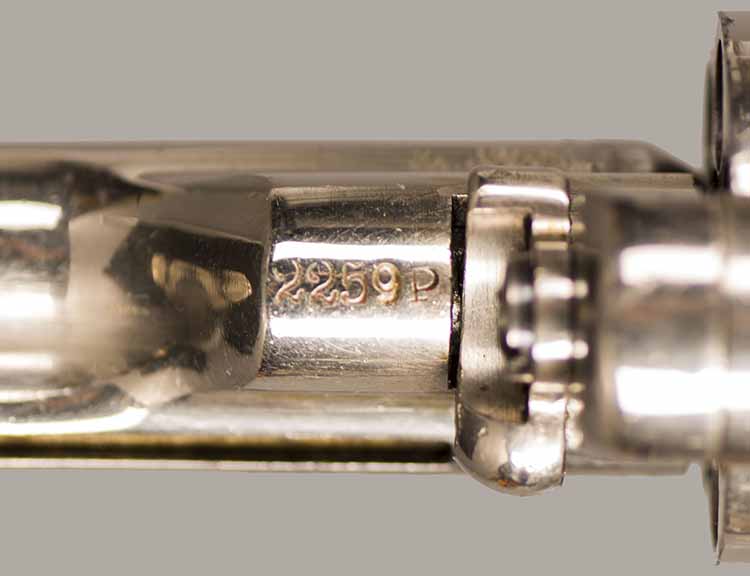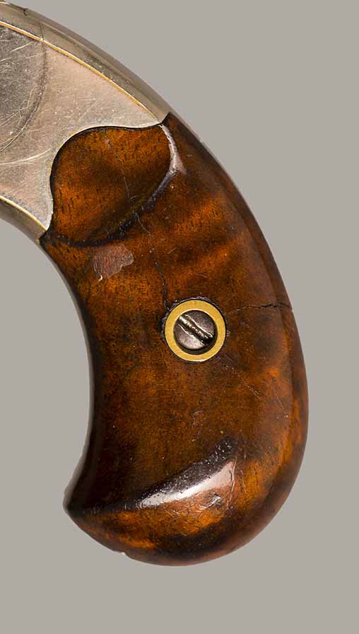 #2259P. Cal. 22 SH/L Rim Fire. 2-3/8" Barrel. 7 shot. Retains 99% of the original full nickel finish. Early "First Model" "WITH" integral ejector and "HIGH" hammer. Varnished walnut grips (Left grip has a hairline crack that is hardly noticable). First type of barrel address marking. Barrels were initially manufactured with or without integral ejctor, this design was discontinued in the serial range #3000 to #3500! Mechanically perfect, bore and cylinder chambers are as new. Matching serial numbers. Made in 1871, first year of production! Total quantity of 114.200. Rare gun in near mint condition.