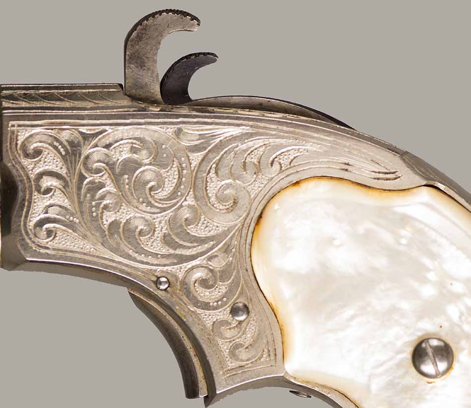 This model was not serial-numbered. Cal.32 RF Extra Short. 5 Shot. 3" Octagon Barrel. The gun is "fully factory" engraved and has special order "thick pearl grips" in new condition. Retains 99% of original overall finish. 5 shot magazine located under the barrel. Mechanically perfect and has a bright shiny bore. This Joseph Rider invention is one of the most unusual of 19th. century pocket pistols and one of the first metallic cartridge weapons using a tubular magazin. Total production of about 13.000, manufactured from 1871 to 1888. Yearly production for this model is not known. Near mint condition! Almost impossible to improve! Great looking gun. Cartridges shown for information purposes only.