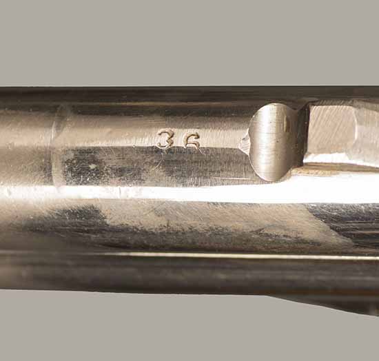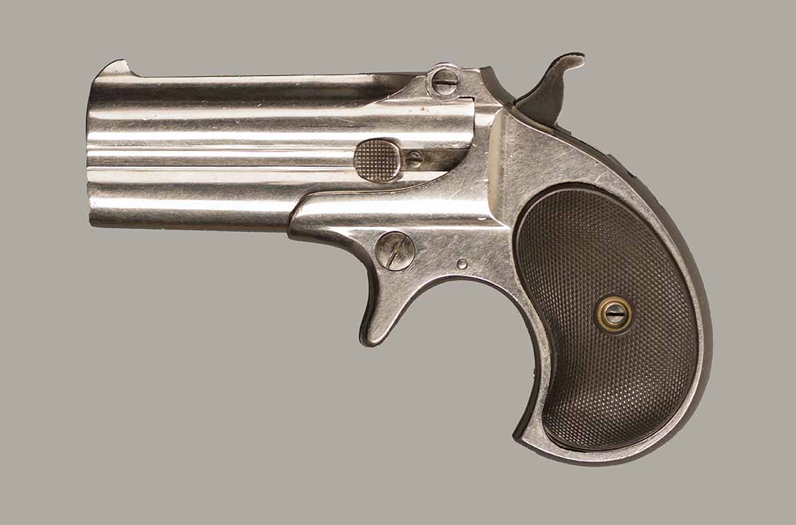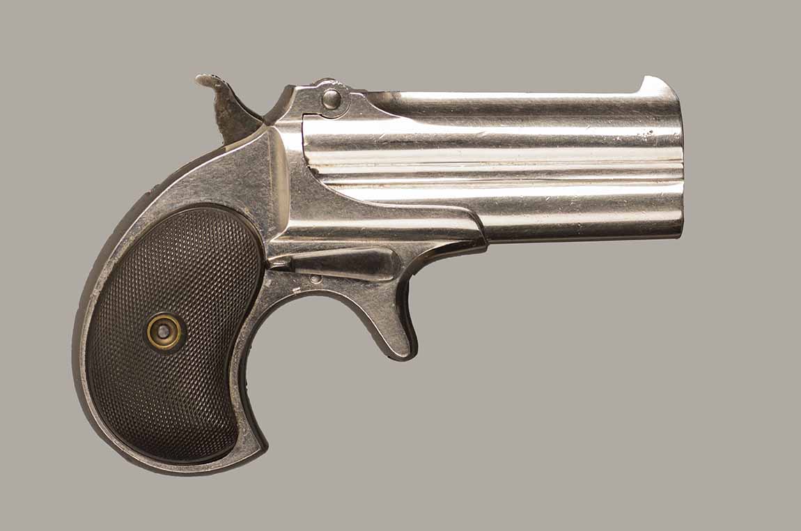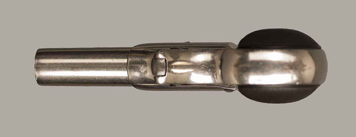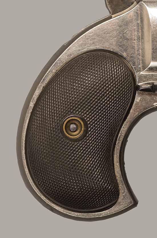 #36. Cal. 41 Rimfire. Standard 3" Barrel. Third Model, third type. Long line signing barrell address! Retains 99% of the original nickel plated finish. Hammer has 98% blue. Correct and perfect black checkered hard rubber grips. Matching serial numbers! Mechanically perfect, bores are excellent. Gun has perfect hinges! Made cc.1888. About 67.000 to 70.000 made. Beautifull deringer in a near mint condition. Would be hard to improve! Cartridges shown for information purposes only.