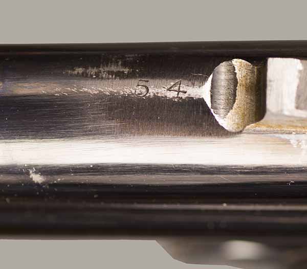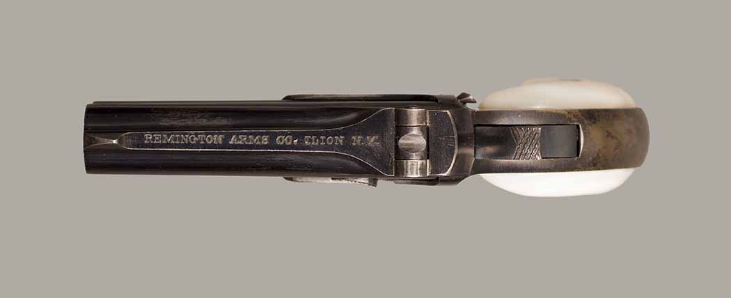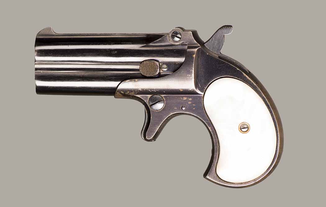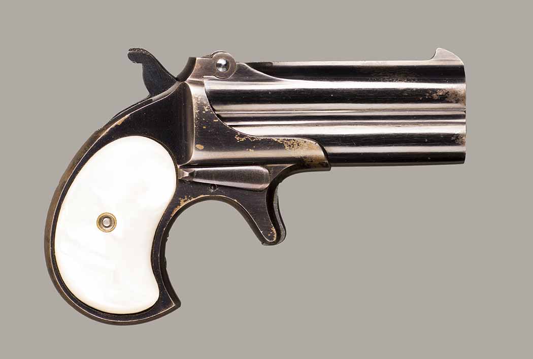 #54. Cal. 41 Rimfire. Standard 3" Barrel. Third Model, third type. Long line signing barrell address! Retains 90% of the original blue finish. Hammer has 98% blue. Correct and perfect pearl grips! Matching serial numbers! Mechanically perfect, bores are excellent. Gun has perfect hinges! Made cc.1888. About 67.000 to 70.000 made. Beautifull deringer in excellent + condition. Cartridges shown for information purposes only.