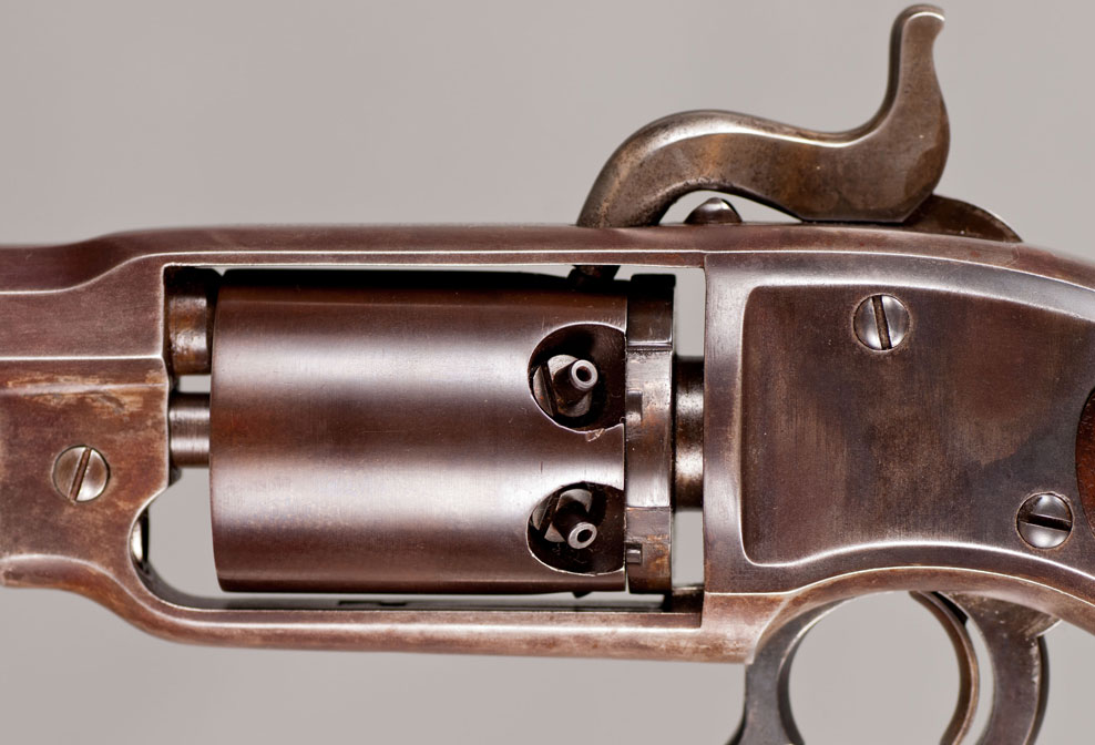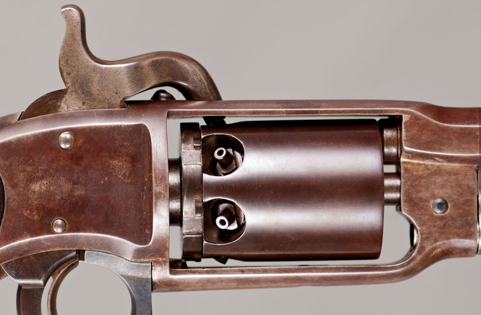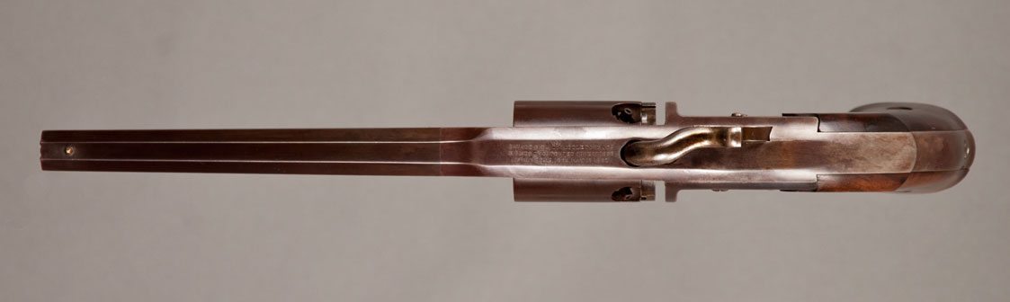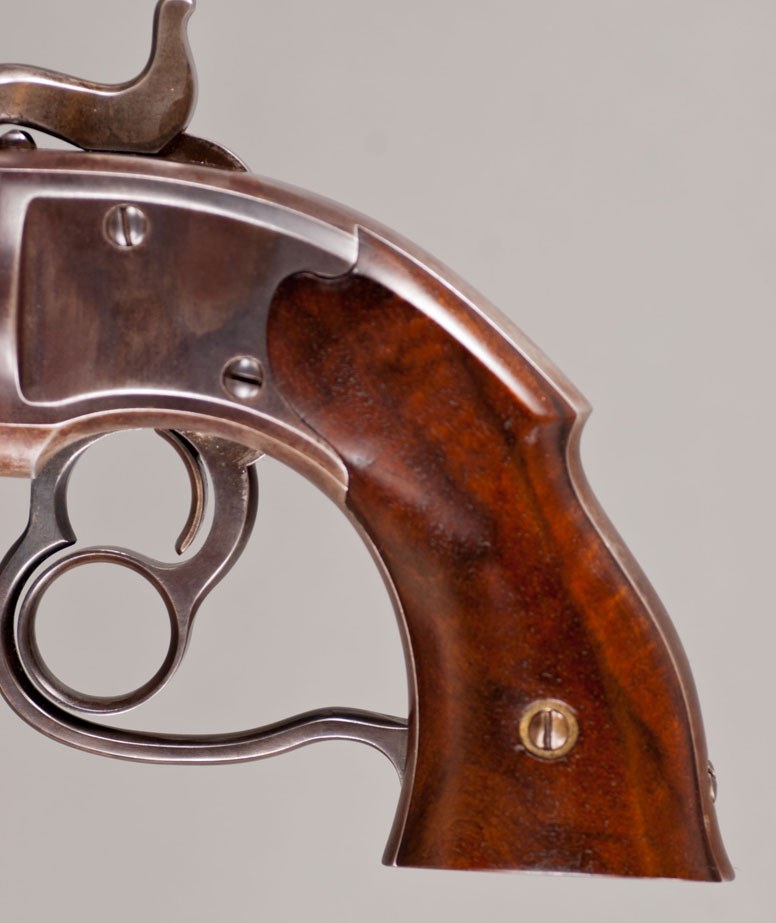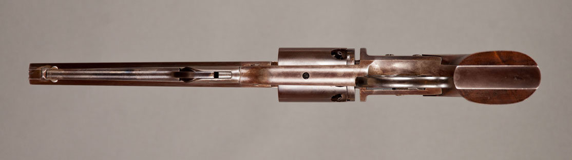 #1506. Cal.36 Percussion. Standard 7-1/8" Barrel. 6 Shot round cylinder. Hinged type loading lever assembly. Flat sided frames with a heart-shaped trigger/lever guard. Gun has a nice brown patina with traces of original blue finish. Some case color visible on hammer. The two piece walnut grips are excellent. The revolver is a civilian model. The standard three-line address and patent markings on top strap are perfect, serial number is located on left grip, on the frame under the right grip and on the bottom of the barrel under the loading lever rammer. Action is perfect. Of the approximately 20,000 Savage “Navy” models produced during the Civil War (1861-1865), the US Ordnance Department took delivery of 11,384 of the guns, and the Navy took delivery of 1,126. The balance of approximately 8,500 guns were sold on the civilian market, although most of these revolvers probably ended up seeing action during the Civil War. They were issued to at least 26 US cavalry regiments and were listed among the arms of some half dozen or more Confederate cavalry regiments. This gun was made in 1861-1862! Impressive Civil War era gun, in a fine condition! Not easy to find!