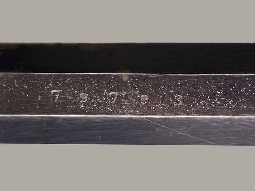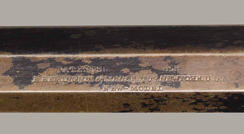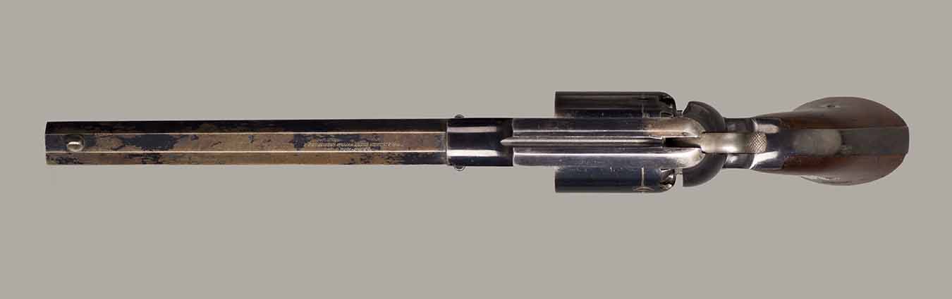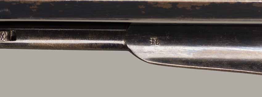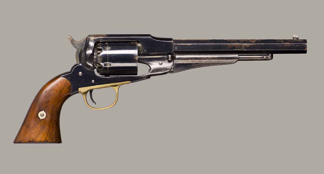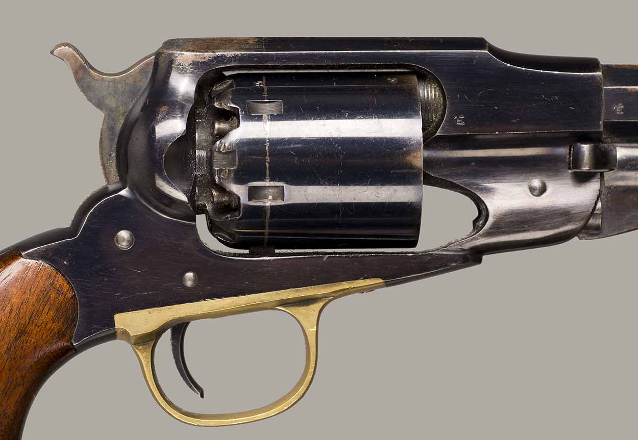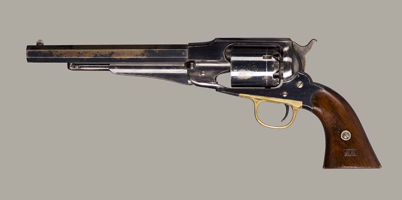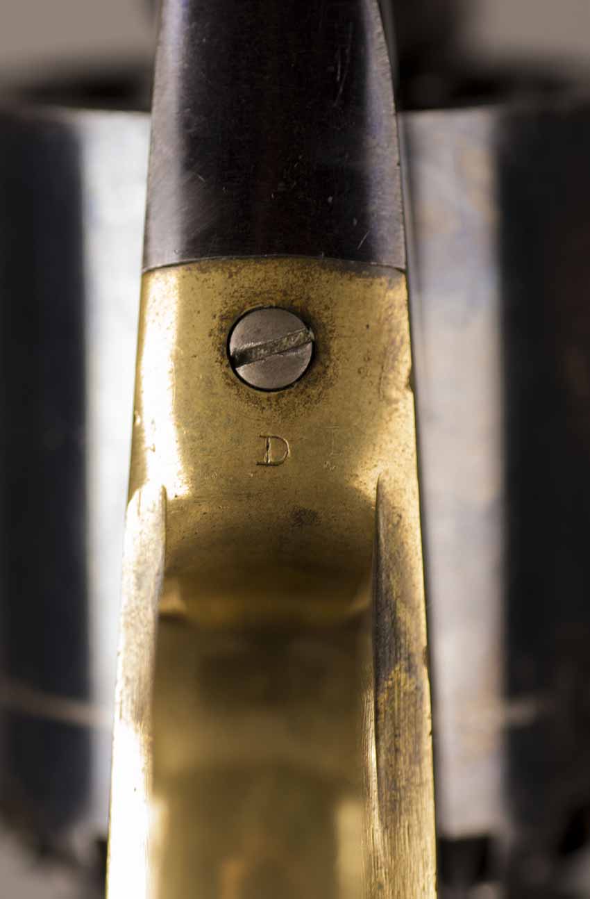 #79793. Cal. 44 percussion. Standard 8" octagon barrel. Matching serial numbers. Retains overall 90% of the original blue, the missing 10% is flaking on the barrel. Hammer has 95% of of original colour case! Standard threaded front sight. Walnut grips in perfect condition. Standard address with top line only partly visible, should read "Patented Sept.14,1858", missing part is clearly factory error, light stamping! Mechanically perfect. Has a mint bore and cylinder chambers. Left grip has a perfect military Inspector cartouche "B.H" (Benjamin Harris; Remington Principal Inspector 1864-65). Single letter Ordnance sub-inspection marks are stamped on most parts of the gun, even on the grips!. The Remington New Model Army Revolver was issued to Federal cavalry regiments during the last two years of the Civil War. Made 1863-1875 with a total production of about 122.000. This gun was made in 1864! An honest Civil War era military revolver, in near perfect condition!! One of the best we have ever offered for sale. Excellent !!