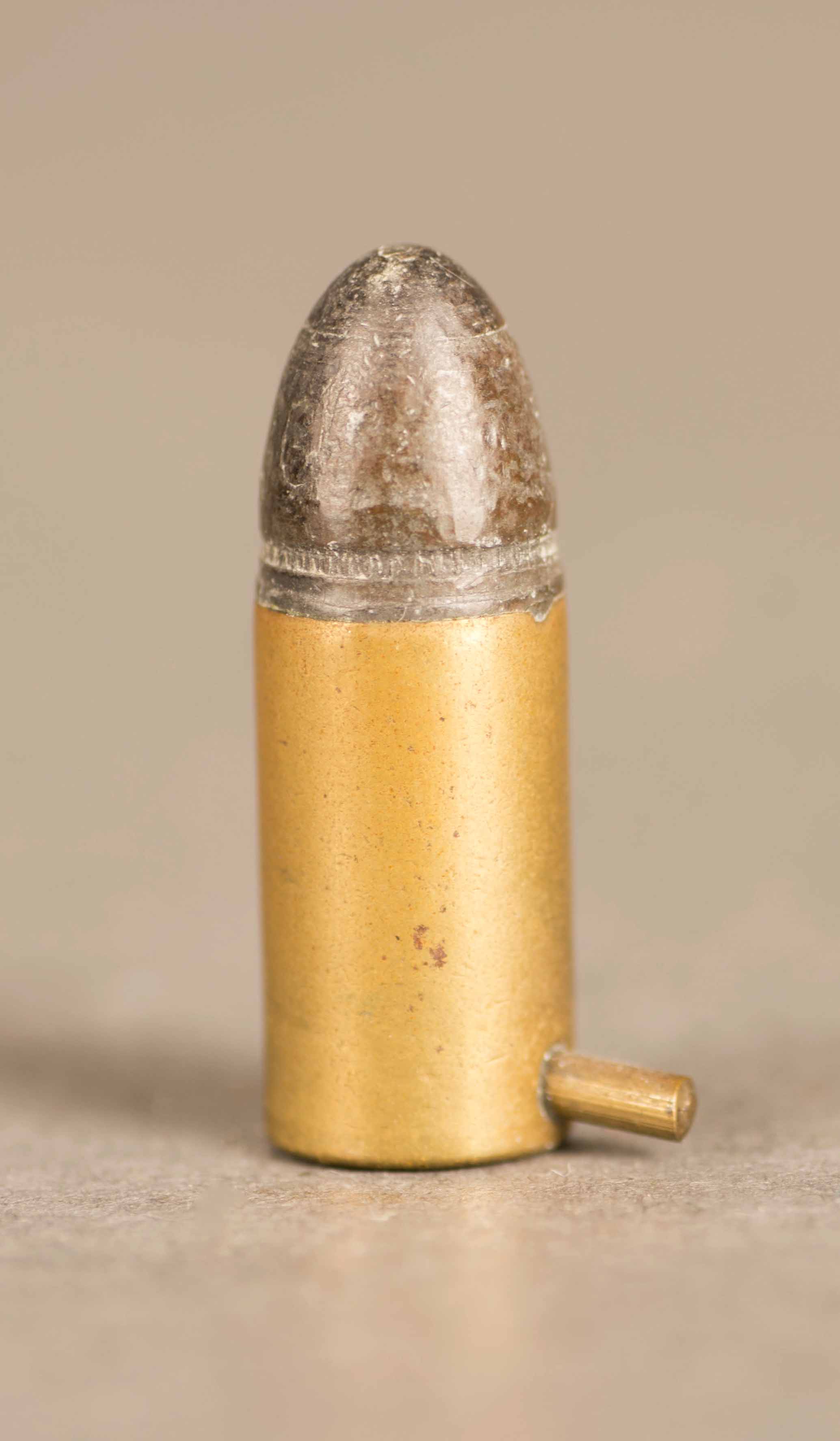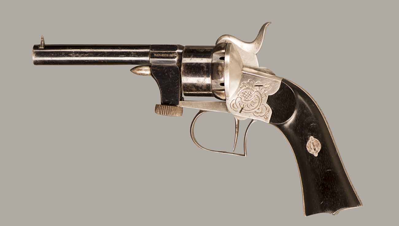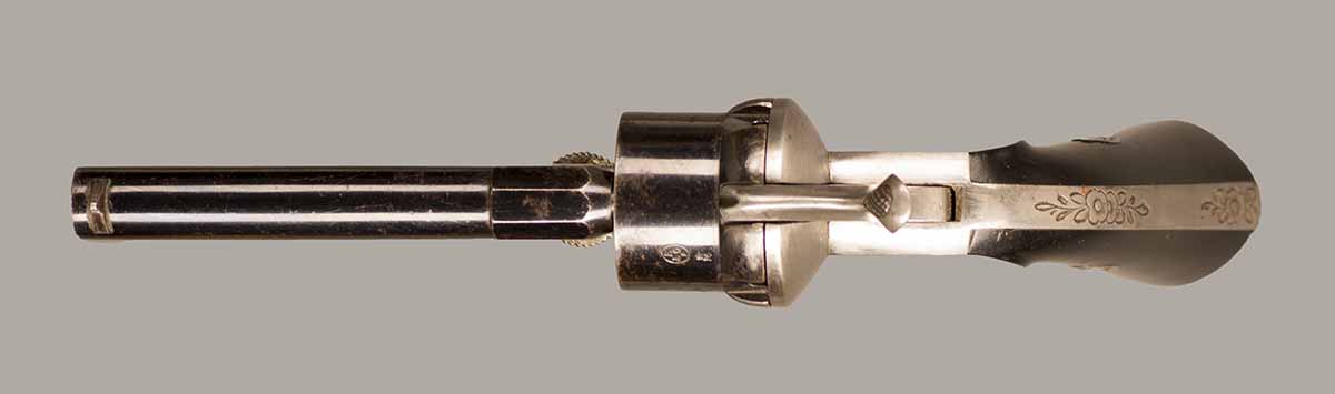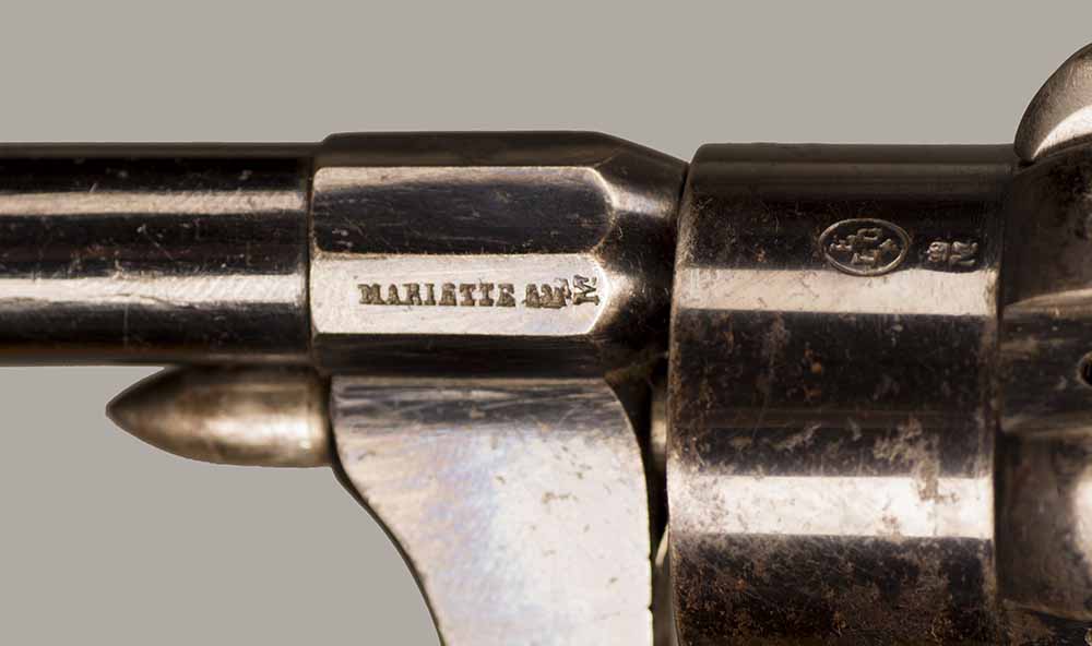 No #. Cal. 7MM. Standard 3 1/2"" Barrel. 95% of the blue finish remaining on Barrel and Cylinder. Nice engraving on frame. Mariette brevete stamped on the frame. ELG proofmark and Crowned "M" stamped on cylinder. Grips in excellent condition. Mechanically perfect. Gun was made in Liège Belgium by Servais Mariette (Son of Guillaume) around 1863. Very fine condition. Cartridge shown for information purposes only.