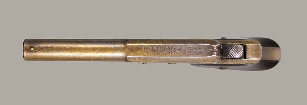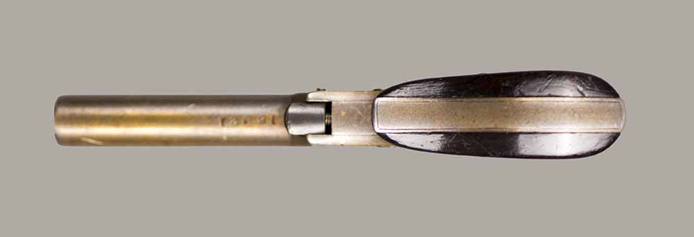 #13921. Cal. 22 Short Rim Fire. Single shot. 3 1/4 " Barrel. Model No.1 Vest Pocket, also called "Saw Handle Deringer". Factory engraved, gold gilded finish. 90% of the original finish is remaining. This type is very rarely seen engraved and gold gilded. Engraving features delicate floral bouquets on each side. Sharp markings. Mechanically perfect, rosewood grips in excellent condition. Bore is excellent. A total production of about 17.000 to 20.000, manufactured between 1863 and 1888. Excellent overall condition. Cartridges shown for information purposes only.