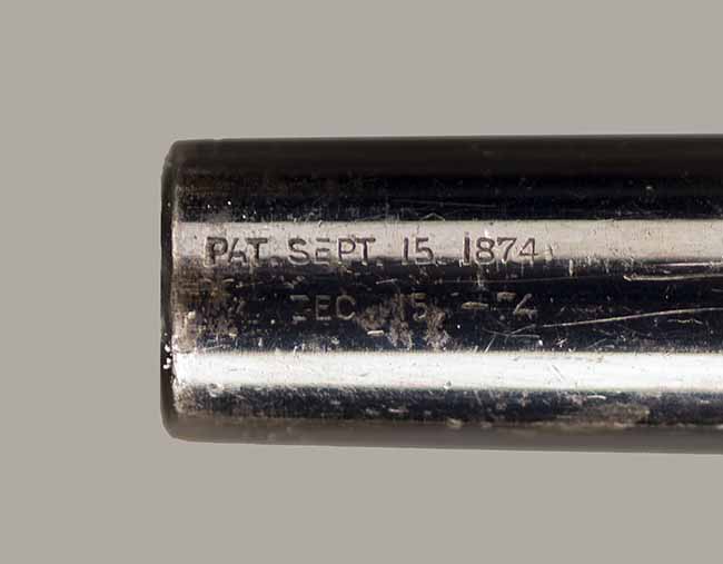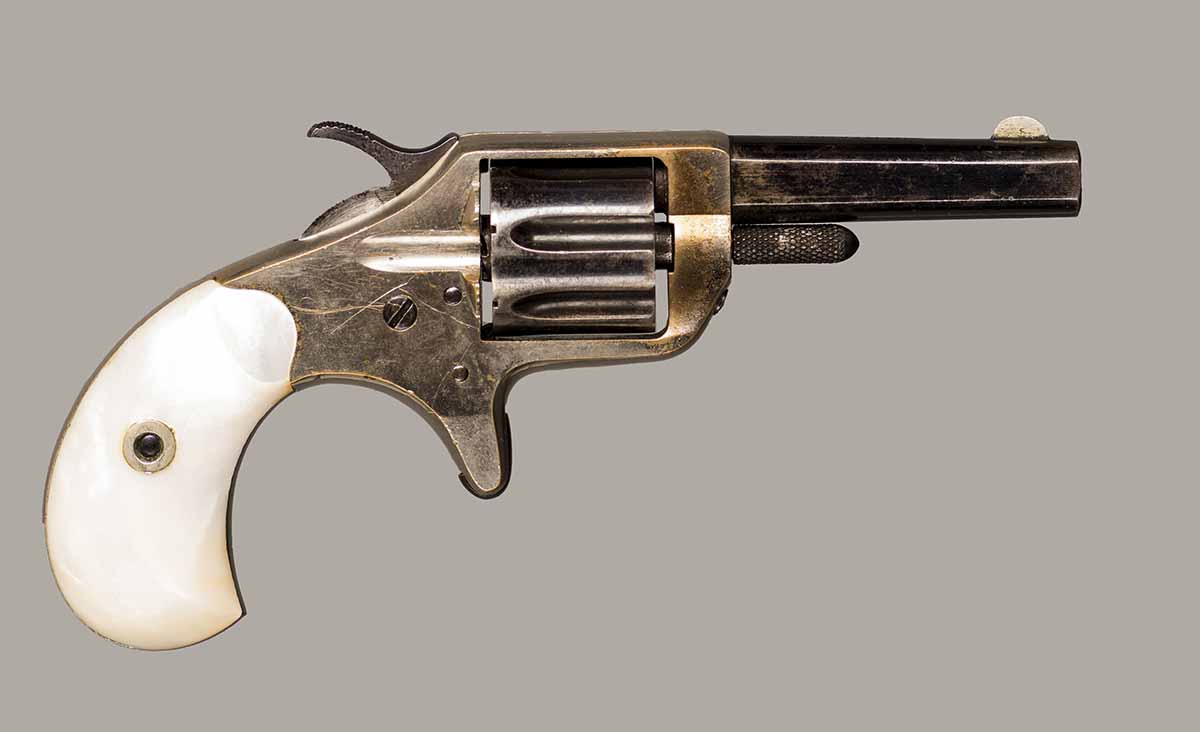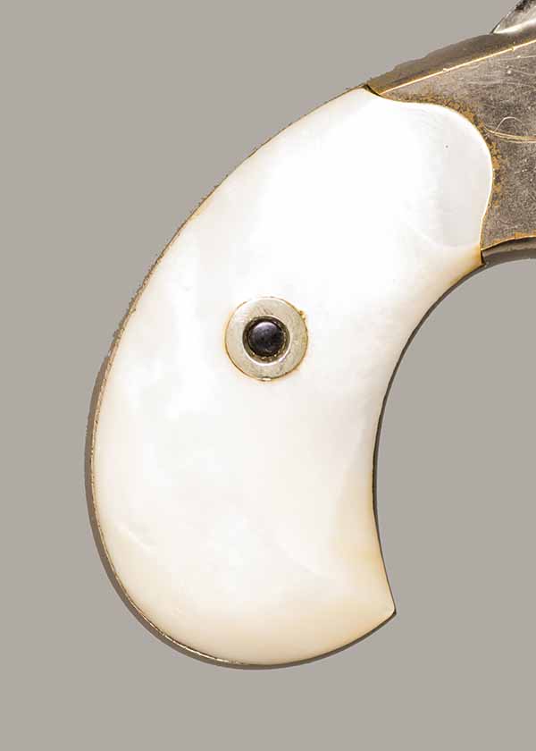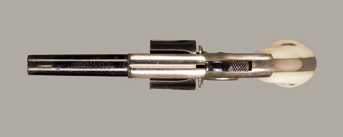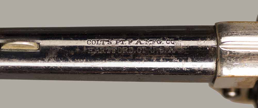 #46615. Cal. 22 Rim Fire. 2 1/4" Barrel. 7 shot cylinder. Second model with long cylinder flutes, locking slots on cylinder back and patent date stamped on barrel. Nickel/Blue finish. Has 90% of the original finish remaining. Comes with beautifull pearl grips. Perfect "COLT NEW 22" etched panel on left side of barrel. Standard Colt address on top of barrel, Patent is visible under the barrel. Mechanically perfect, with a very fine bore and seven near new chambers in the cylinder. Matching serial numbers. Made in 1877. Total production of the second model is about 39.000. Excellent overall. Cartridges shown for information purposes only.