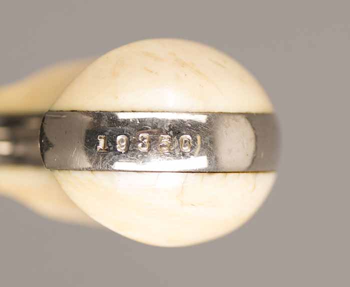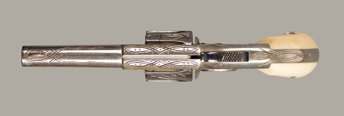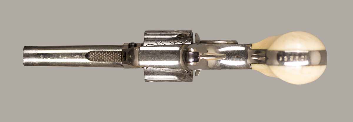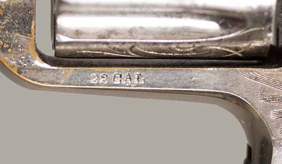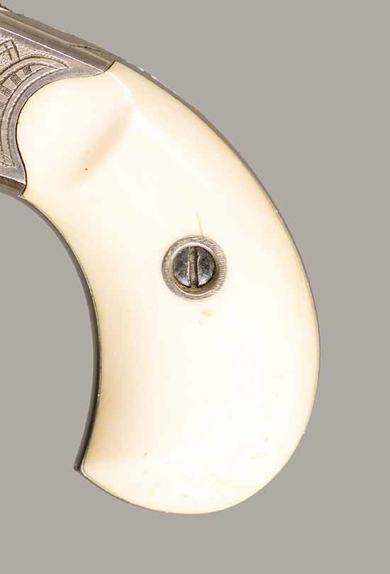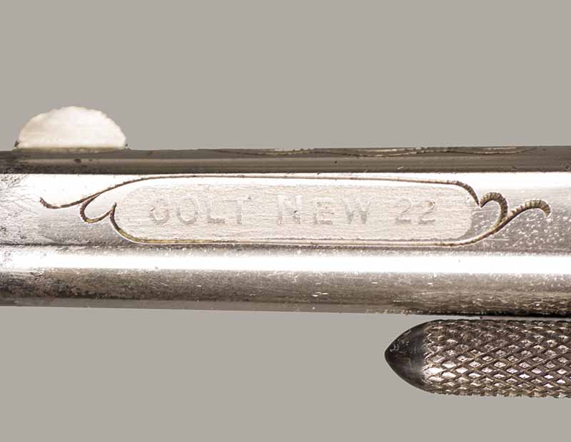 #19350. Cal. 22 Rim Fire. 2 1/4" Barrel. 7 shot cylinder. Second model with long cylinder flutes, locking slots on cylinder back and patent date stamped on barrel. Standard pattern factory engraving , nickel finish. Has 99% of the original finish remaining. Comes with beautifull ivory grips. Engraved .22 caliber New Line pistols were nearly always fitted with ivory or pearl grips. Perfect "COLT NEW 22" etched panel on left side of barrel. Standard Colt address on top of barrel. Patent is visible under the barrel. Matching serial numbers. Mechanically perfect, with a excellent bore and seven near new chambers in the cylinder. Made in 1876. Total production of the second model is about 39.000. Excellent overall, would be difficult to improve! Cartridges shown for information purposes only.