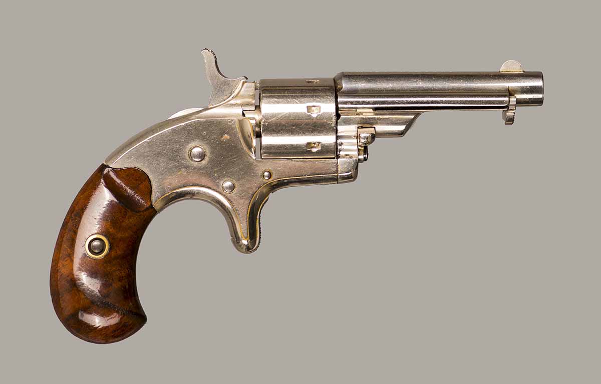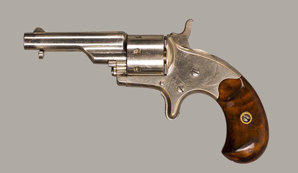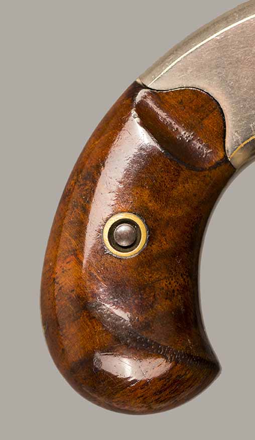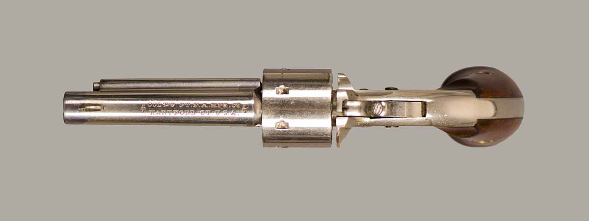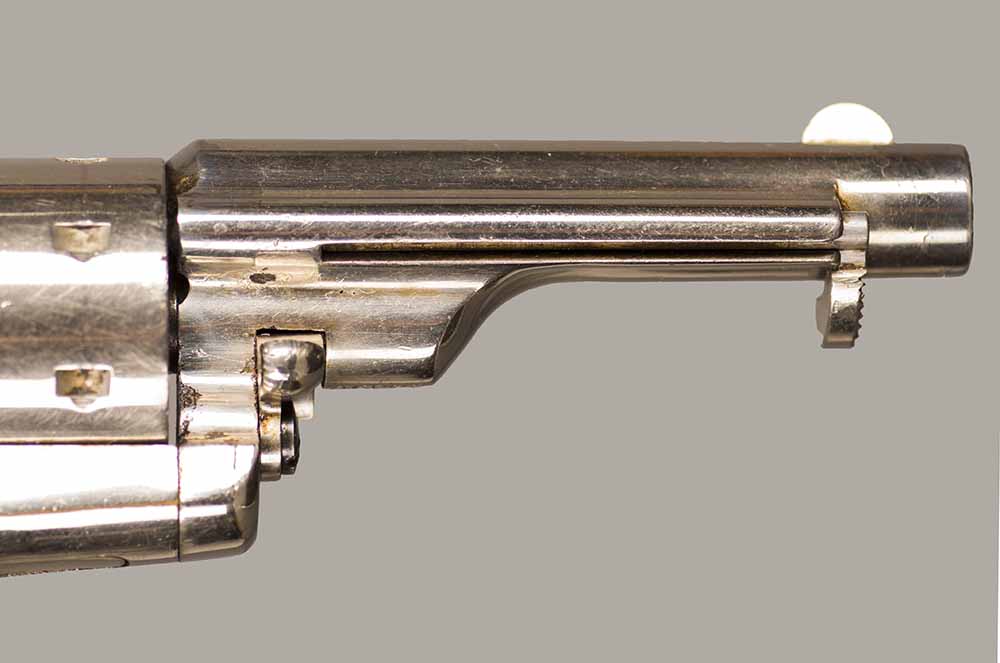 #2259P. Cal. 22 SH/L Rim Fire. 2-3/8" Barrel. 7 shot. Retains 99% of the original full nickel finish. Early "First Model" "WITH" integral ejector and "HIGH" hammer. Varnished walnut grips (Left grip has a hairline crack that is hardly noticable). First type of barrel address marking. Barrels were initially manufactured with or without integral ejctor, this design was discontinued in the serial range #3000 to #3500! Mechanically perfect, bore and cylinder chambers are as new. Matching serial numbers. Made in 1871, first year of production! Total quantity of 114.200. Rare gun in near mint condition.