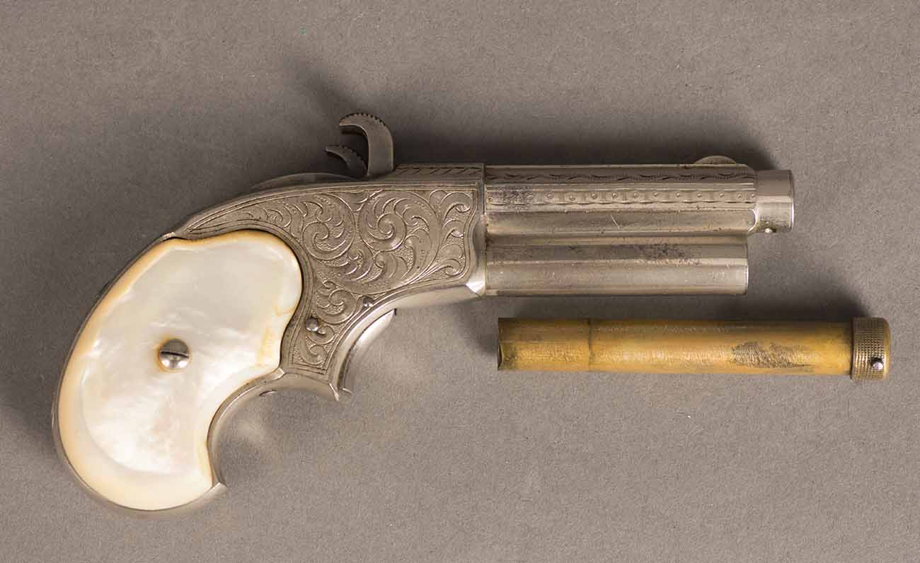 This model was not serial-numbered. Cal.32 RF Extra Short. 5 Shot. 3" Octagon Barrel. The gun is "fully factory" engraved and has special order "thick pearl grips" in new condition. Retains 99% of original overall finish. 5 shot magazine located under the barrel. Mechanically perfect and has a bright shiny bore. This Joseph Rider invention is one of the most unusual of 19th. century pocket pistols and one of the first metallic cartridge weapons using a tubular magazin. Total production of about 13.000, manufactured from 1871 to 1888. Yearly production for this model is not known. Near mint condition! Almost impossible to improve! Great looking gun. Cartridges shown for information purposes only.